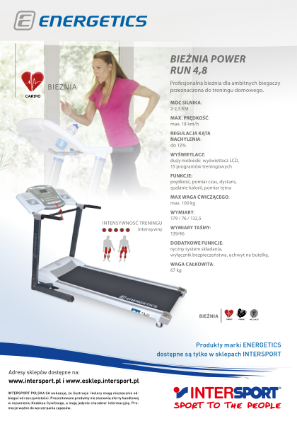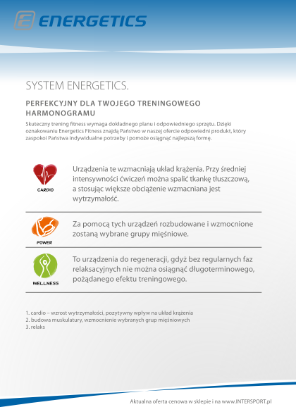 Trenerzy fitness opracowali na marki Energetics trzy treningi interwałowe, które z powodzeniem można zastosować na rowerku, crosstrainerze oraz bieżni. Efekty stosowania tego treningu dają spektakularne rezultaty przy stosunkowo krótkim czasie jego wykonywania. Wszystko dlatego, że interwały w porównaniu do tradycyjnych metod treningowych pozwalają znacznie szybciej poprawić wydolność oraz spalić tkankę tłuszczową.