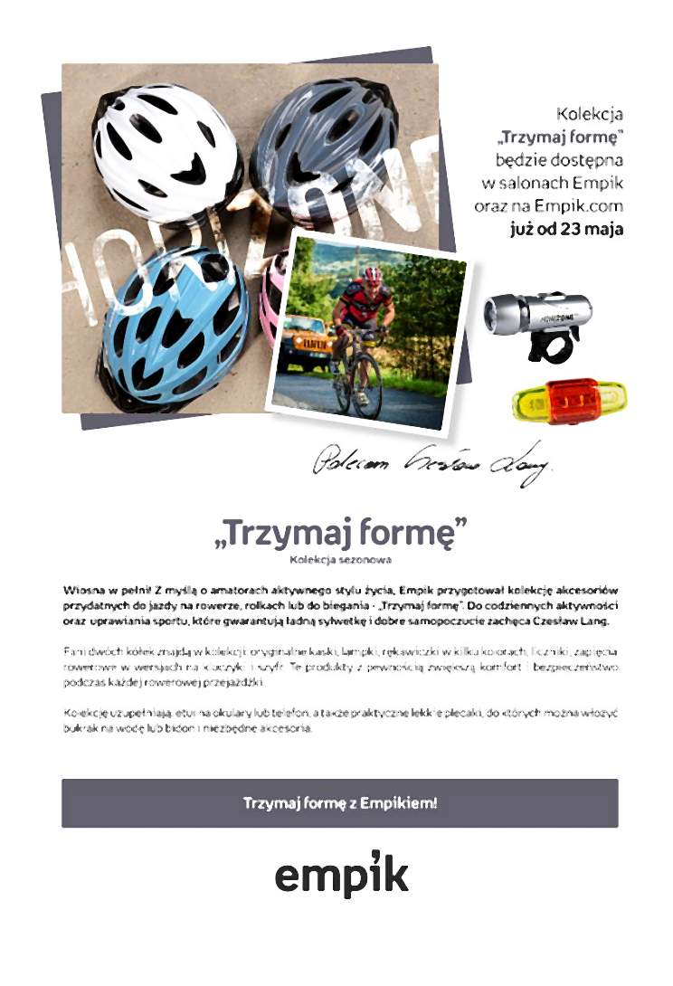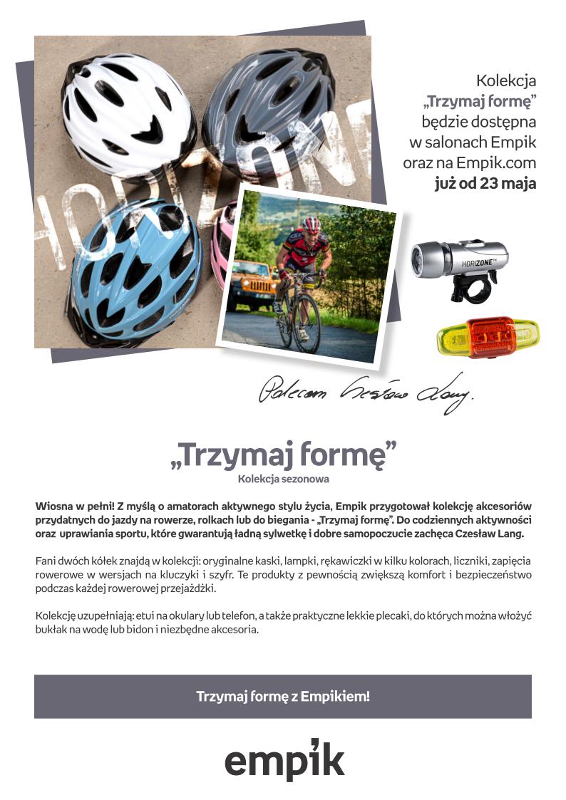 Wiosna w pełni! Z myślą o amatorach aktywnego stylu życia, Empik przygotował kolekcję akcesoriów przydatnych do jazdy na rowerze, rolkach lub do biegania – ?Trzymaj formę?. Do codziennych aktywności oraz uprawiania sportu, które gwarantują ładną sylwetkę i dobre samopoczucie zachęca Czesław Lang.