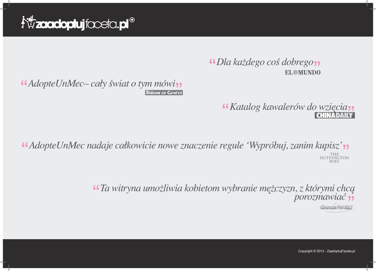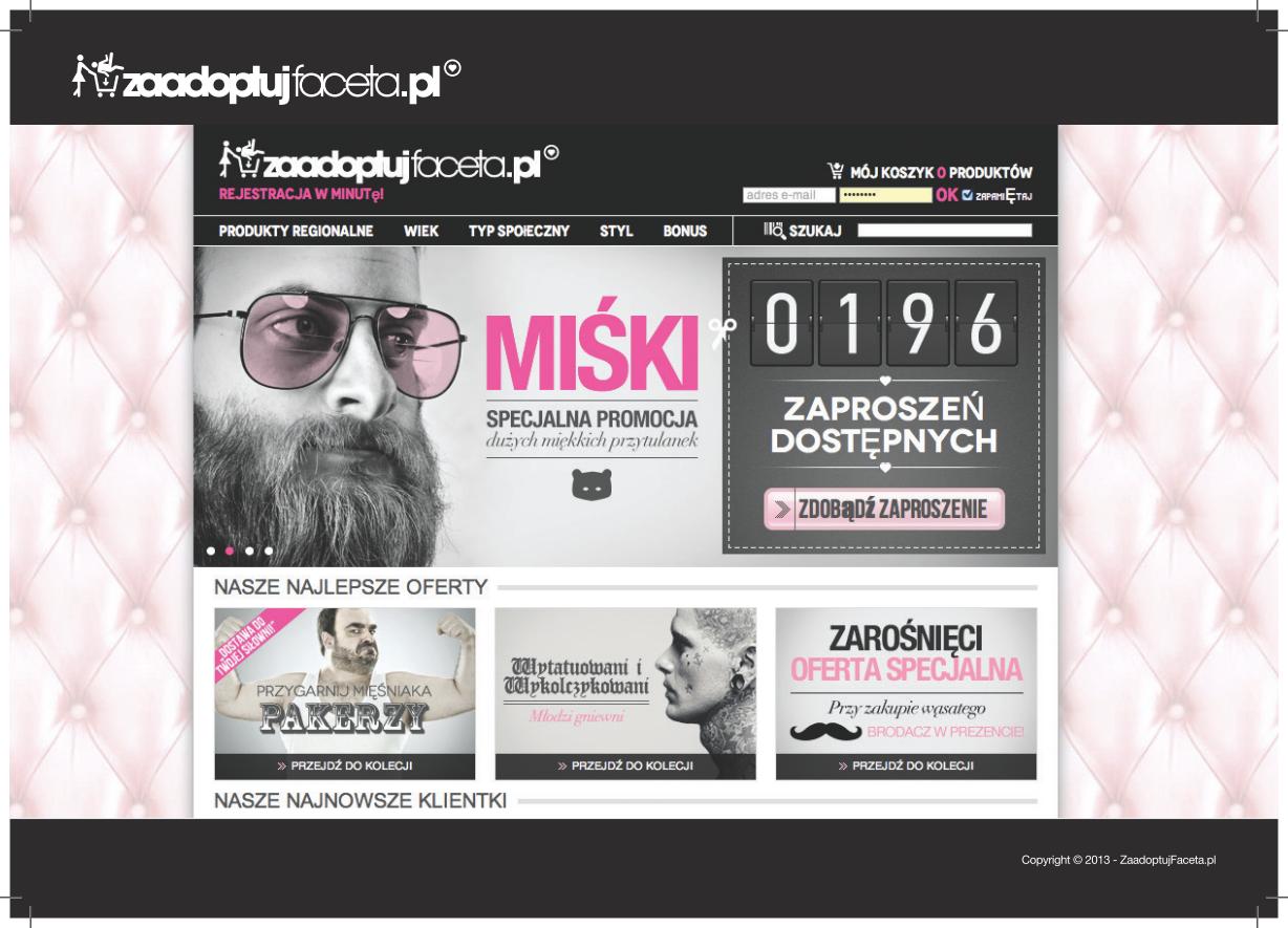 ZaadoptujFaceta.pl to niebanalny serwis społecznościowy, w którym władza należy do kobiet. Serwis zrywa ze stereotypem potulnej kobiety czekającej na księcia z bajki i odwraca role w relacjach damsko-męskich. W 2014 roku kobieta, która wykonuje pierwszy krok, nie powinna być uważana za ?łatwą?. Portal odpowiada na oczekiwania generacji ?wyrośniętych nastolatków?, którzy dotąd uważali serwisy randkowe za przestarzałe lub ?dla prawdziwych desperatów?.