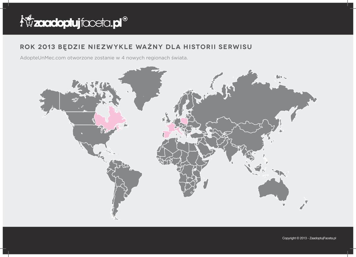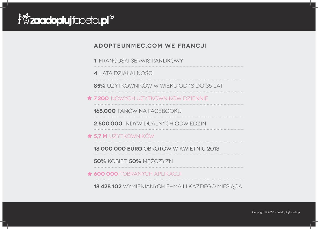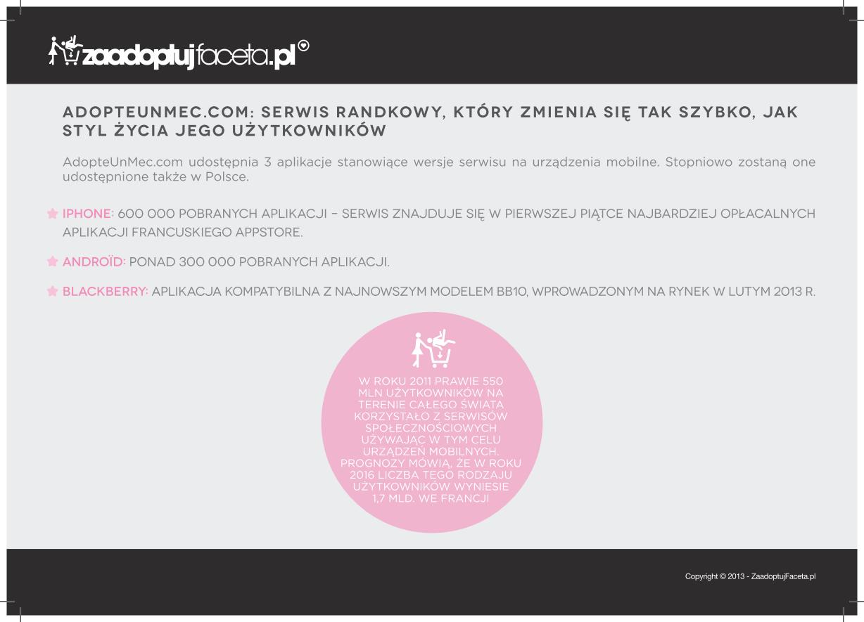 Transformację roli kobiet dostrzegł m.in. serwis ZaadoptujFaceta.pl, który zdobywa coraz większą popularność wśród młodych Polek i Polaków. Na ZaadoptujFaceta.pl to kobiety wybierają mężczyzn, z którymi chcą rozmawiać. I ta formuła ewidentnie działa, skoro wśród zarejestrowanych użytkowników jest 51 proc. kobiet i 49 proc. mężczyzn. Pod względem kulturowym jest to prawdziwa innowacja ? w tradycyjnych kulturach kobietom nie wypadało uwodzić mężczyzn. Francuzi wręcz oszaleli na punkcie jego pierwowzoru – AdopteUnMec.com. Nie mieć tam konta to jak w Polsce nie być na Facebooku. Średni czas spędzany w serwisie to już 15 minut, co jest świetnym wynikiem (na Facebooku to odpowiednio 28 minut).Normą we Francji jest dzielenie się informacjami o nawiązanych znajomościach czy otrzymanych wiadomościach na AdopteUnMec.com.